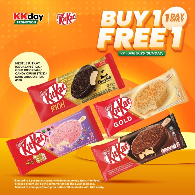 KK Super Mart 6月22日推出超值优惠!KitKat 冰淇淋Buy 1 Free 1,其中包括KitKat Stick, Gold, Candy Crush, Dark Choco Ice Cream Stick~