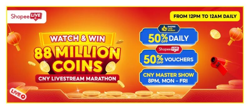 只要锁定 ShopeeLIVE 新年直播马拉松相关频道,观看直播、参与互动,就有机会把金币带回家!看得越多,赢得越多;玩得越开心,新年越 Huat!