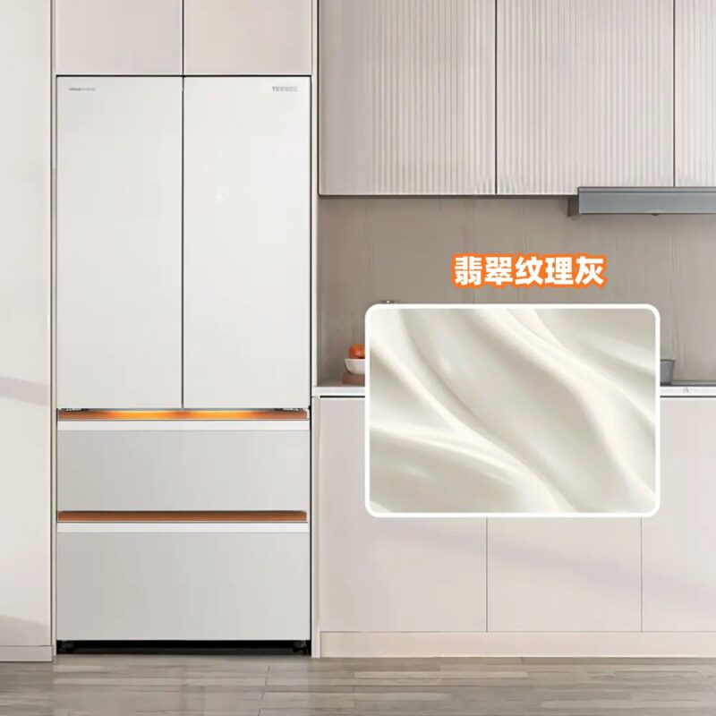翡翠纹理灰呈现温暖米色调,如琥珀般柔和光泽,为厨房增添精致的东方雅致,轻松融入温馨家庭氛围。同时支持纯平全嵌入橱柜设计,与整体空间无缝融合,让厨房线条更加干净利落。冰箱面板采用 9 层雕刻工艺,经 1200℃ 手工烧制,不仅防刮耐油,更方便日常清洁。