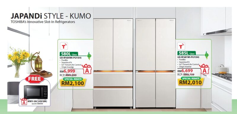 凡于2026年2月16日至4月30日期间购买 Toshiba JAPANDi 系列 KUMO  冰箱的顾客,即可获赠一台价值 RM999 的 MW3-SAC24SF (BK) 24-litre 3-in-1 Convection Air Fry Microwave Oven。赠品数量有限,送完为止哦!